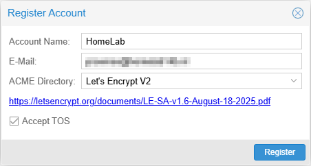 - Create an ACME account in Proxmox and register it with Let’s Encrypt