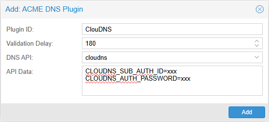 Specify an name for the Plugin ID. Set a Validation Delay (timeout) that ClouDNS needs to propagate the new DNS entry across all servers in the world. It can take up between 1 and 3 minutes (180 seconds) before this process is complete. It depend on what kind of zone / account you have with ClouDNS. The paid ones have 60+ Anycast DNS servers, instead of the free account who only have 4 servers.